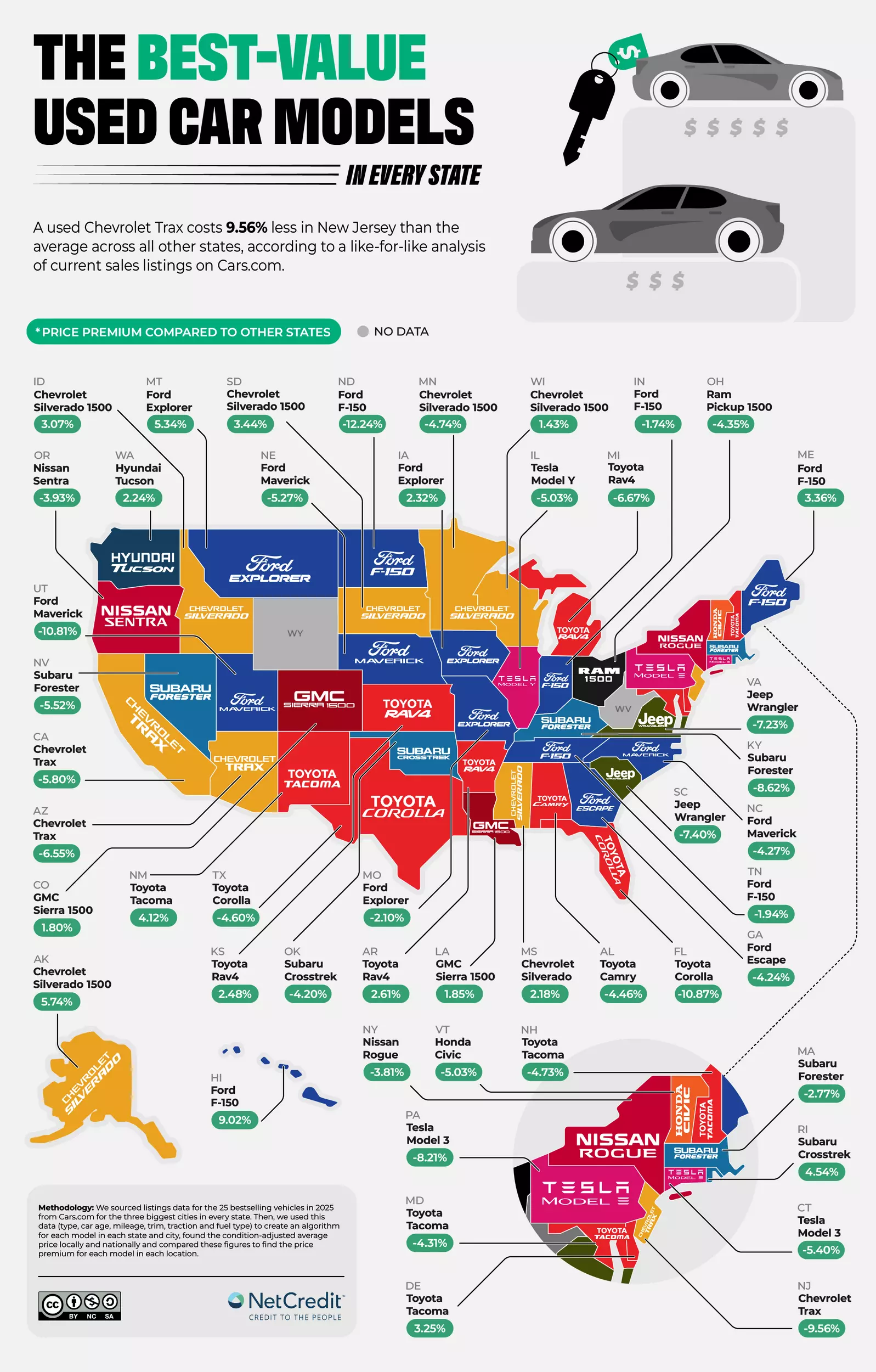 A new report was put together by NetCredit and they analyzed 299,089 used car listings across the U.S., comparing local prices against the national average to identify the best-used car model in each state.